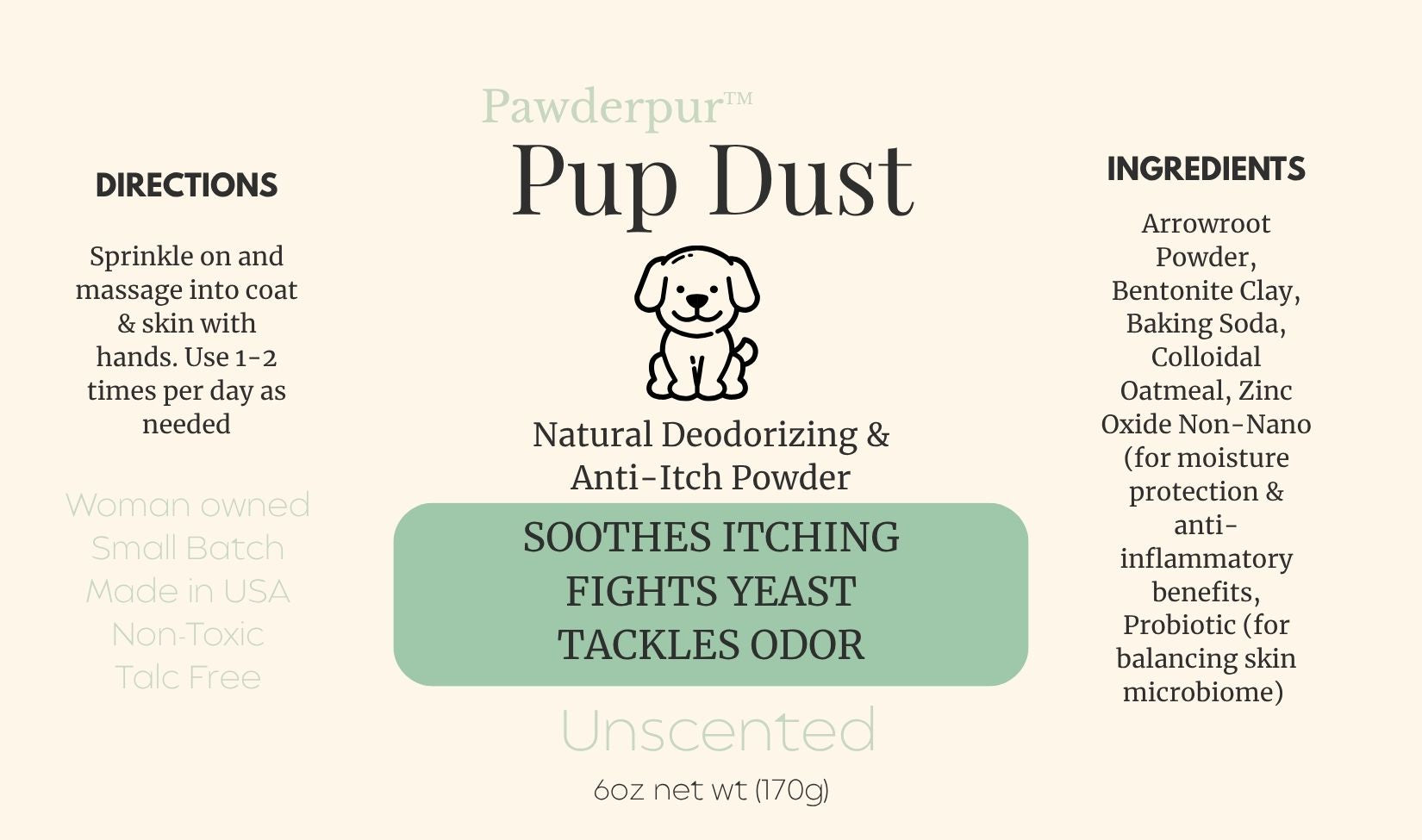 Give your dog instant relief with Pup Dust - A powerful natural powder formulated to soothe itchy skin, combat yeast, and eliminate odors without harsh chemicals or synthetic fragrances.